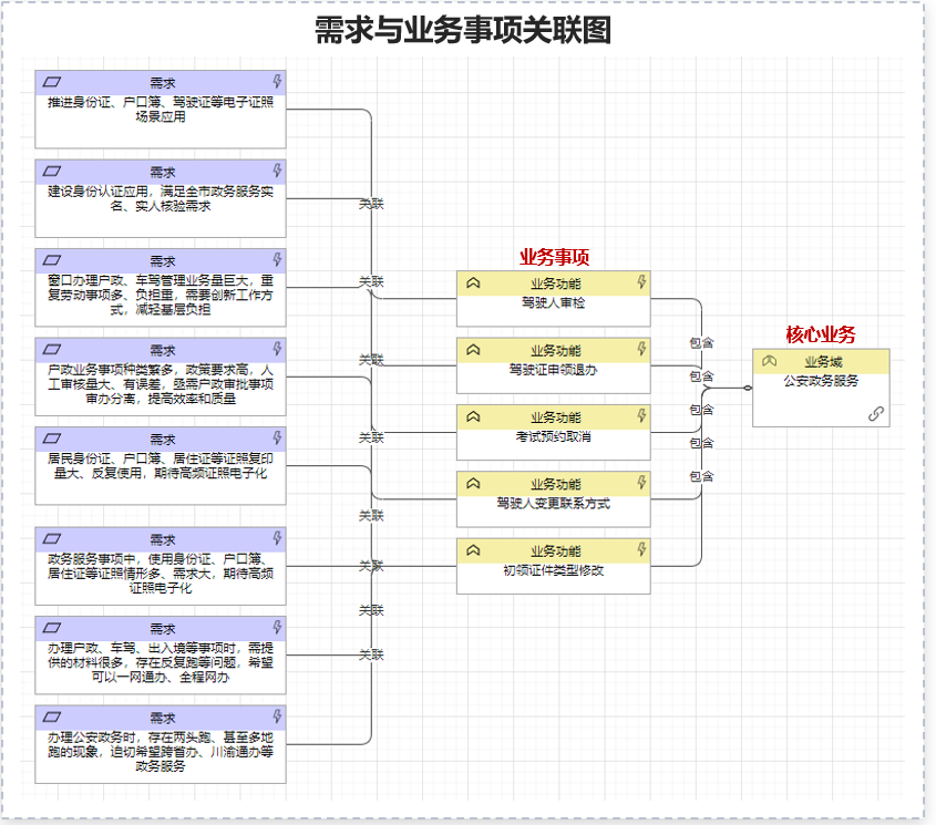 需求與業(yè)務(wù)事項(xiàng)關(guān)聯(lián):通過(guò)工具將重大需求關(guān)聯(lián)到核心業(yè)務(wù)及業(yè)務(wù)事項(xiàng)。定準(zhǔn)核心業(yè)務(wù)是“V”模型應(yīng)用的起點(diǎn),從需求出發(fā),謀劃多跨場(chǎng)景的第一步就是要找到場(chǎng)景所在的核心業(yè)務(wù)和事項(xiàng),自此開(kāi)始對(duì)業(yè)務(wù)進(jìn)行多跨場(chǎng)景的拆解和集成。