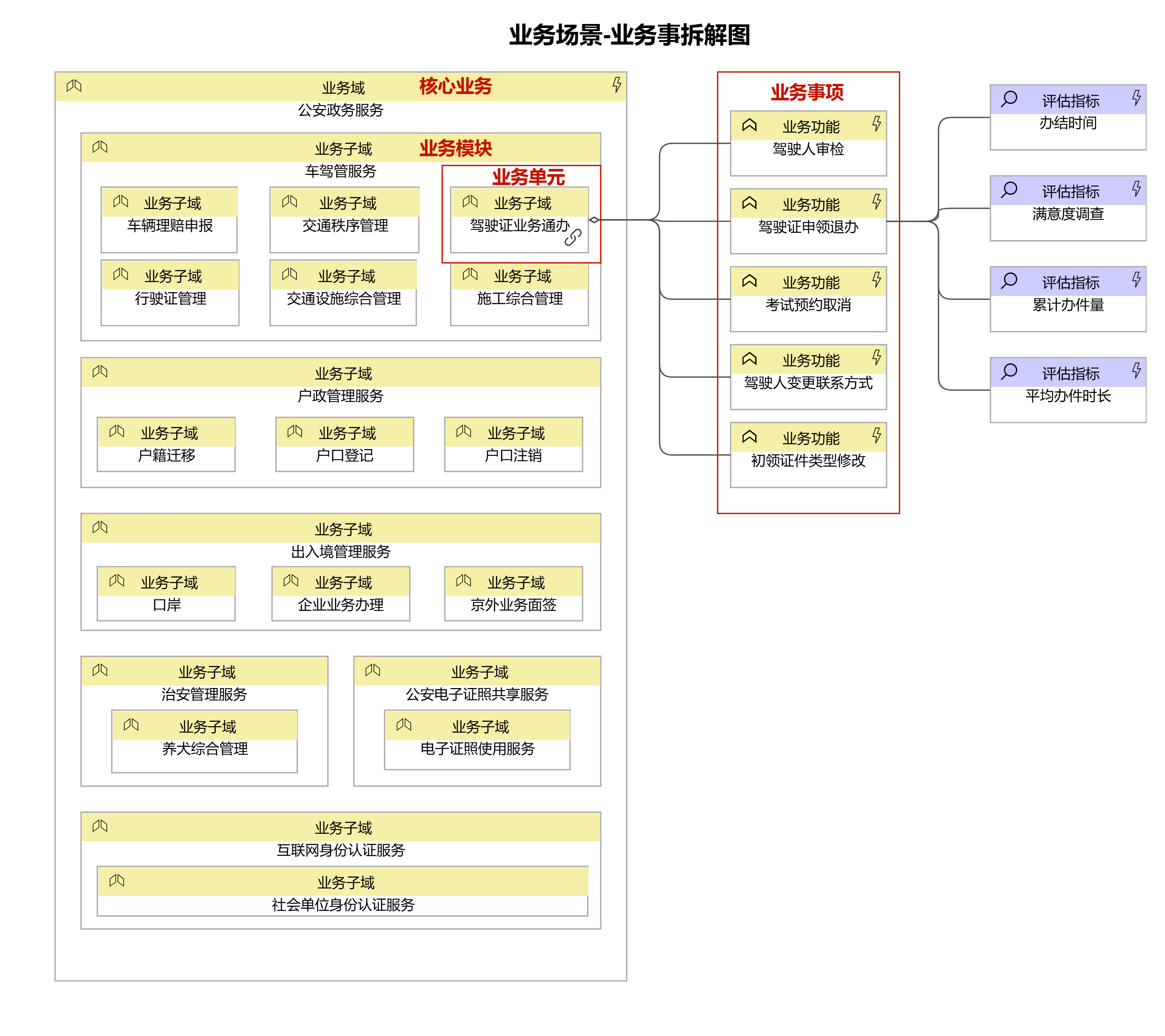 業(yè)務(wù)場(chǎng)景與事項(xiàng)拆解:從“大場(chǎng)景”中尋找“小切口”,對(duì)核心業(yè)務(wù)逐層拆解出業(yè)務(wù)場(chǎng)景、業(yè)務(wù)單元,直至最小級(jí)別的業(yè)務(wù)事項(xiàng)。最小級(jí)別的業(yè)務(wù)事項(xiàng)可以理解為單個(gè)部門(mén)履職具體化的最小單元,它關(guān)聯(lián)了主責(zé)部門(mén)、使用的數(shù)據(jù)等要素。對(duì)多個(gè)業(yè)務(wù)事項(xiàng)編排,形成解決特定業(yè)務(wù)需求的流程。因此,謀劃多跨協(xié)同場(chǎng)景需要將業(yè)務(wù)拆解到最小級(jí)別的業(yè)務(wù)事項(xiàng)才能滿足要求。