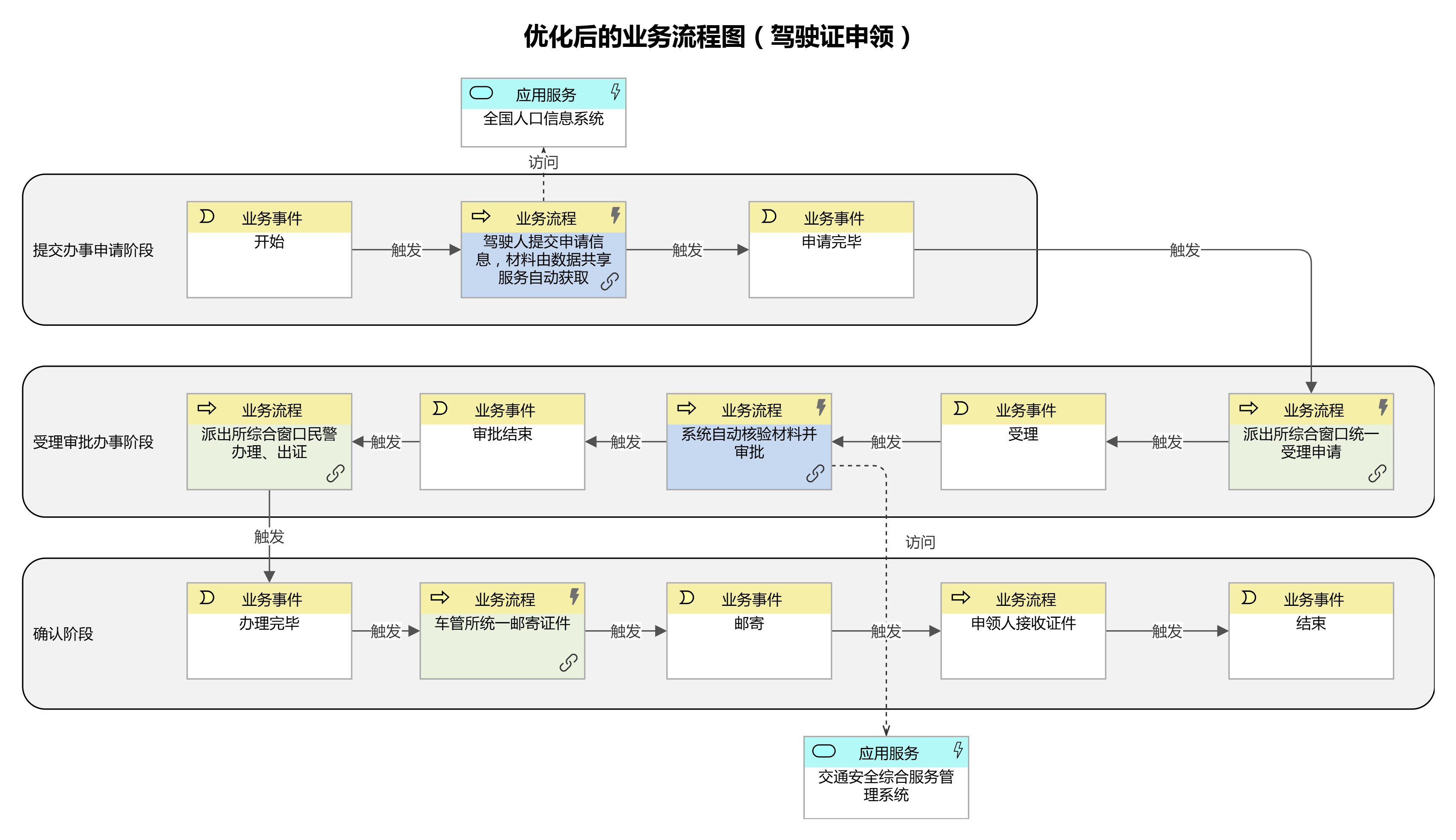 優(yōu)化業(yè)務(wù)流程:謀劃好可集成的數(shù)據(jù)、可協(xié)同的部門(mén)后即完成了多跨場(chǎng)景的集成過(guò)程。集成后形成的新流程活動(dòng)替換現(xiàn)行活動(dòng),實(shí)現(xiàn)流程的再造。再造流程將解決重大需求中描述的“堵點(diǎn)”、“卡點(diǎn)”問(wèn)題,因此新流程中的創(chuàng)新活動(dòng)、智能活動(dòng)就是需要改革的項(xiàng)目。