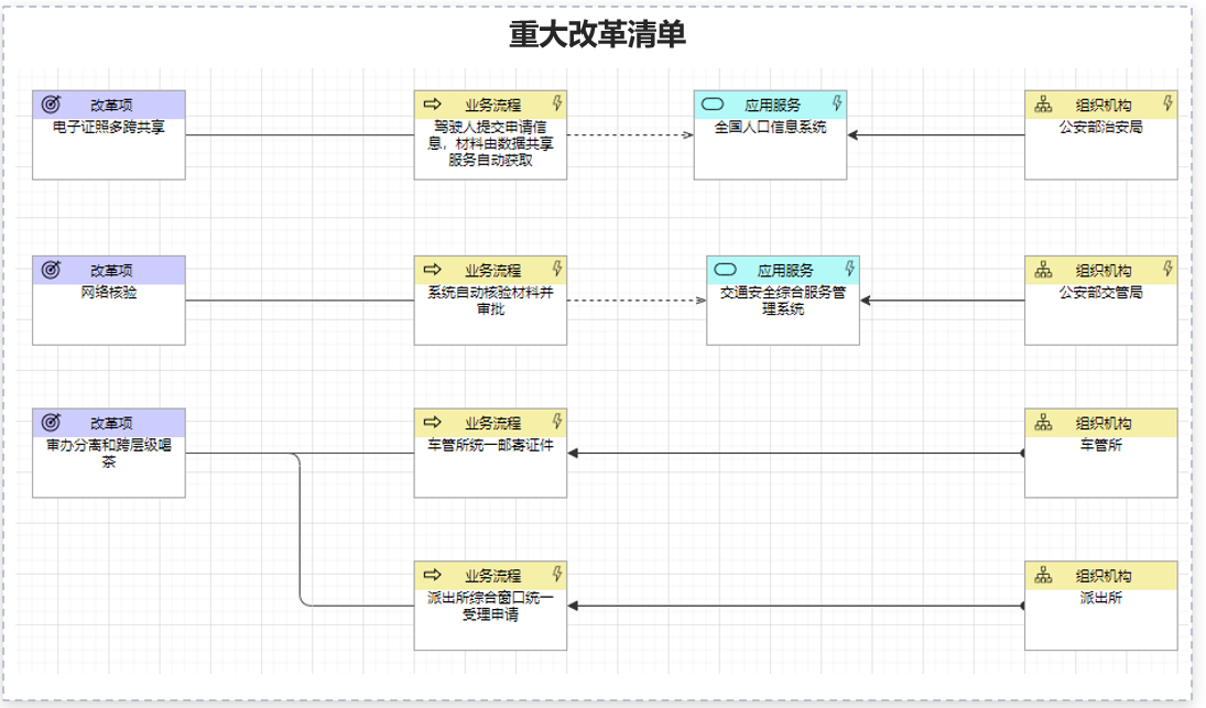 將再造流程中的創(chuàng)新點(diǎn)關(guān)聯(lián)到涉及的應(yīng)用系統(tǒng)以及主管部門(mén),即可形成完整的改革項(xiàng),最終作為梳理重大改革清單的素材。